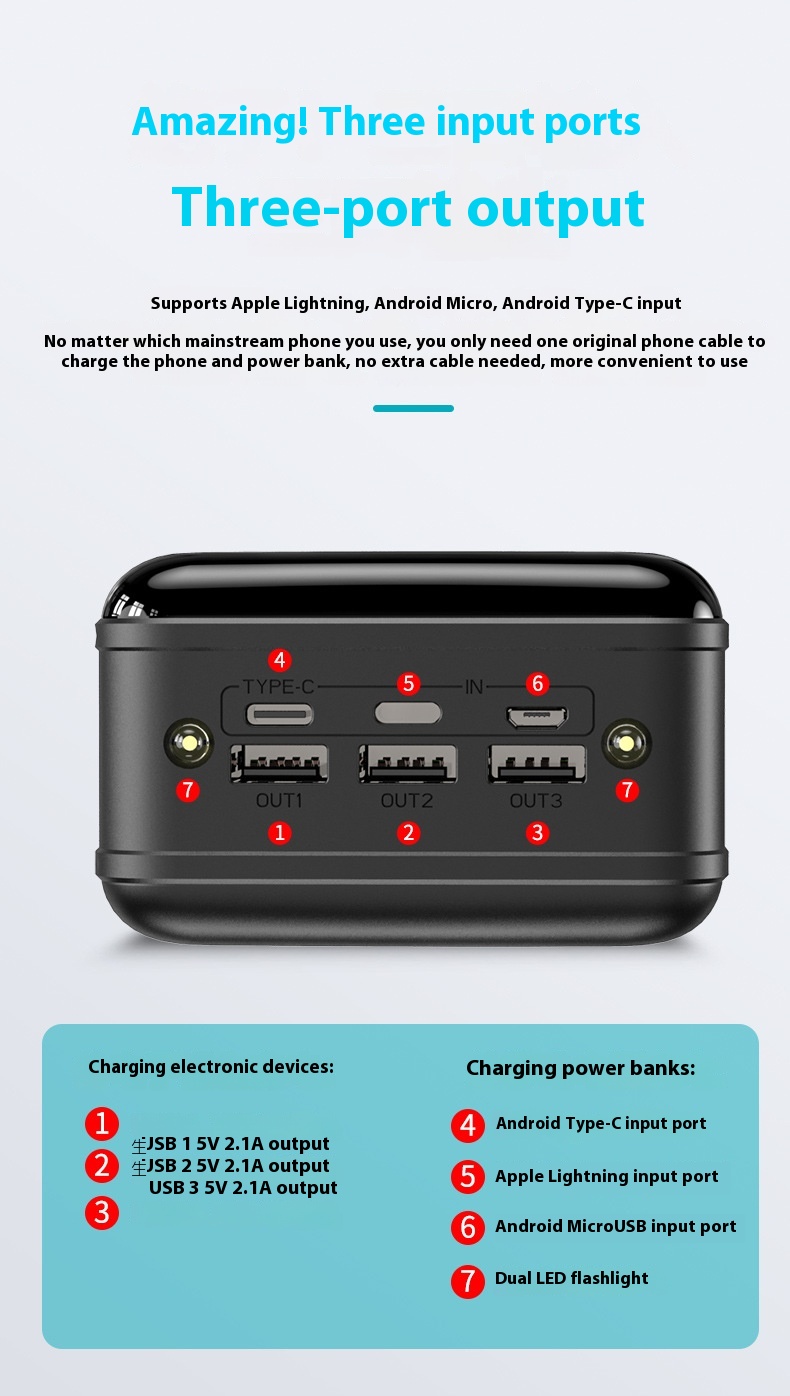 Function: with LED flashlight, multi-U port output, power digital display